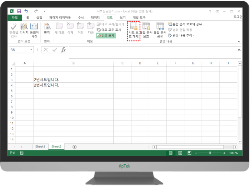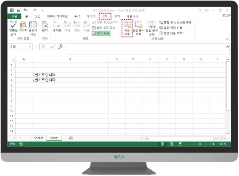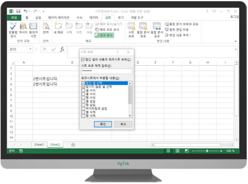시트보호를 하는 방법은 많이 아실텐데요, 특정 시트에서 검토 메뉴 > 시트보호를 클릭하면